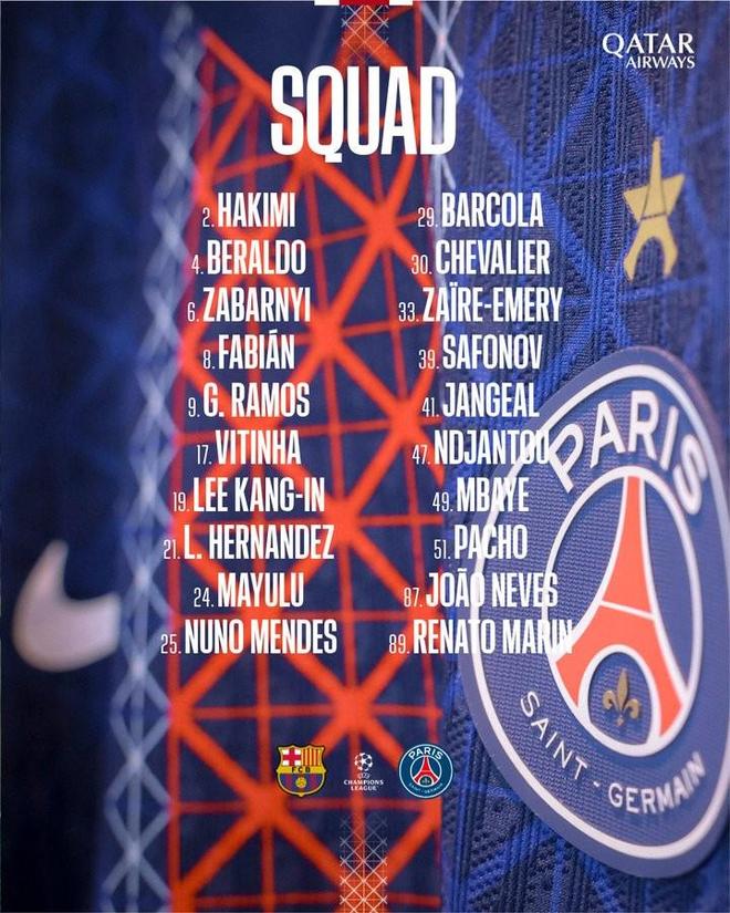 中场:8-法比安-鲁伊斯、17-维蒂尼亚、19-李刚仁、24-马尤卢、33-扎伊尔-埃梅里、41-让热亚尔、87-若昂-内维斯